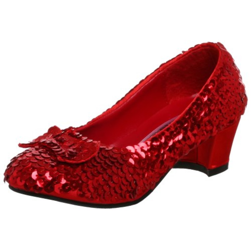 This shoe has a 1.5" red satin covered heel and is covered in lots of shiny sequins. There is a red sequined bow at the arch of the shoe. Inside is lined and has a padded foot cushion.Color: Red SequinGirls Size: S (11-12), M (13-1), L (2-3) , XL (4-4.5)PL