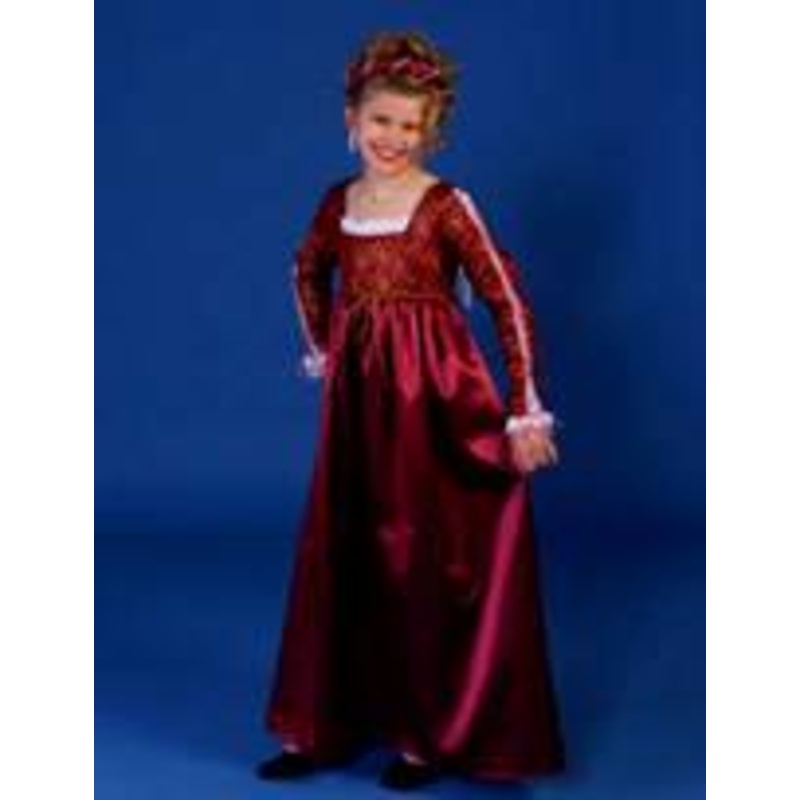 Excellent QualityMaroon/Plum floor length dress accented w/metallic gold trim & brocade at bodice & sleeves, whiteruffle at bodice, sleeve inset & cuff& matching jeweled headpiece.Color: Maroon/Plum (shown)Size: XS (3-4), S (5-6), M (7-8),L (10-12), XL (14