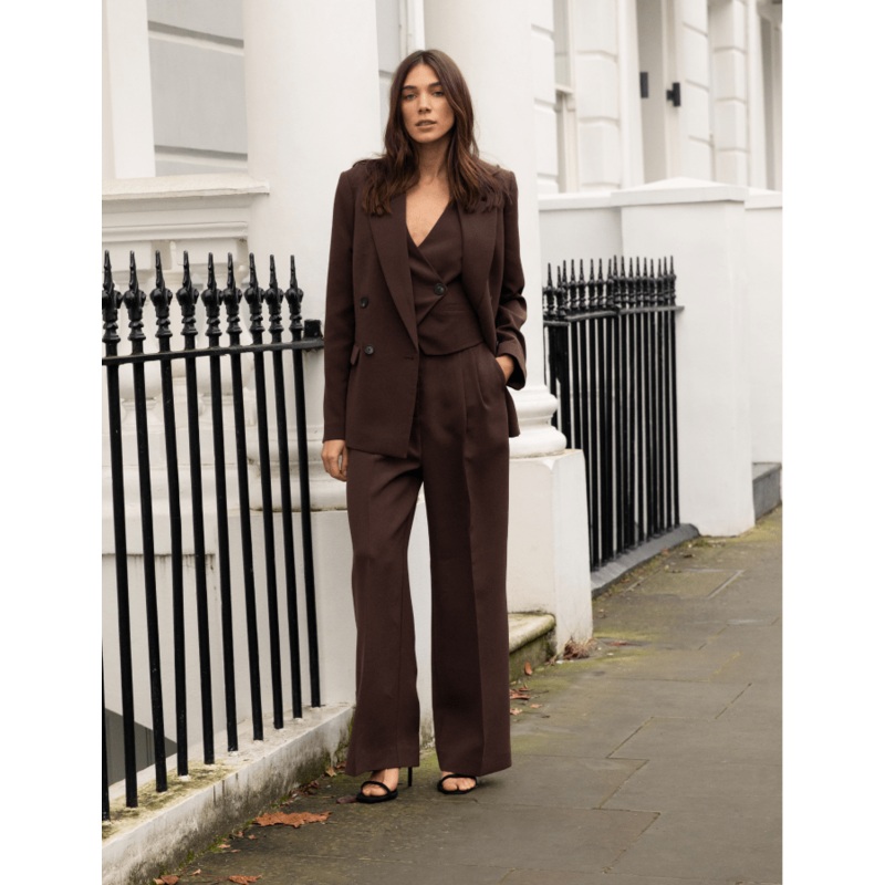 A new take on tailoring. In the trending shade of the season, our brown trousers sit high on the waist and feature a double pleat front and a stylish wide leg. Wear with our matching waistcoat and boyfriend blazer for the full look.