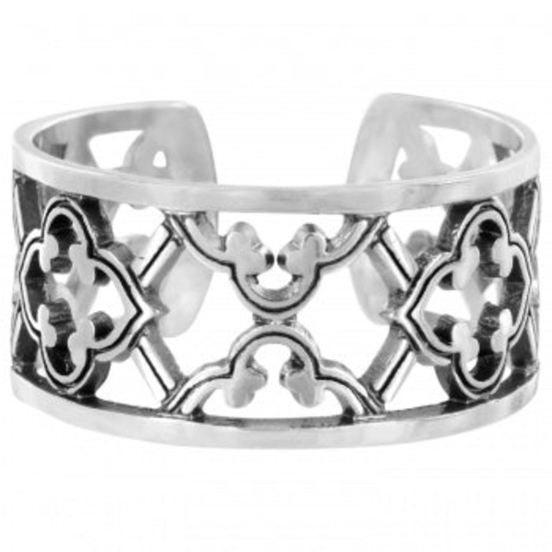 Echoing the filigree designs of our Christo Cuffs, this ring miniaturizes the Toledo motif in an utterly elegant way. Sorry, cannot be fitted with leather insert.Height: 3/8"Finish: Silver plated