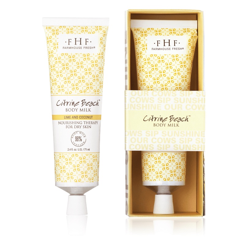 Sold in a 2 oz. tube for travel, along with a decorative box that reads “Our Cows Sip Sunshine.”