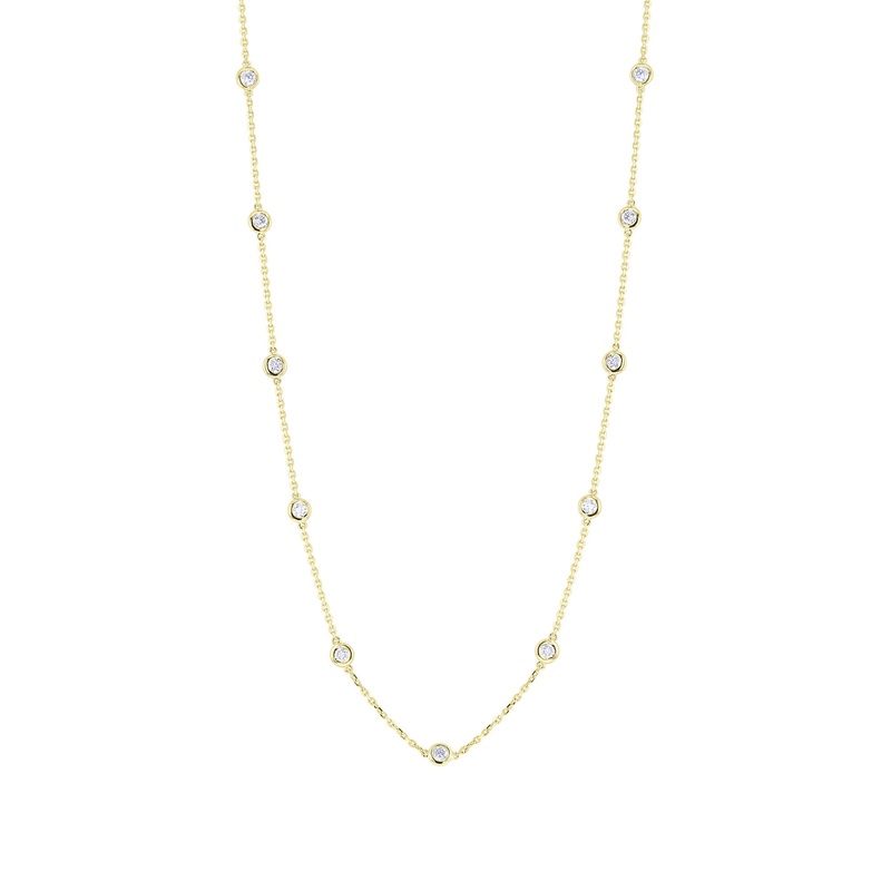 One of our most complimented necklaces features 1 1/2 carat of bright white round brilliant diamonds, set into bezel stations along a 14 karat gold 18 inch chain. Looking to add more sparkle to an already fabulous piece? This necklace can act as a diamond chain on other necklaces, too!