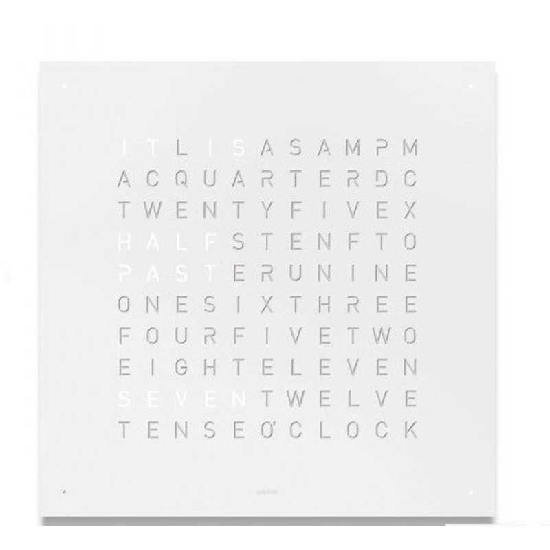 QLOCKTWO CLASSIC with interchangeable front cover WHITE PEPPER made of white, matt powder-coated stainless steel.