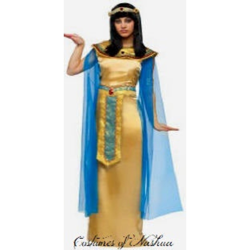 Includes: Gold satin gown with attached sheer chiffon shoulder drape & metallic gold belt, matching Egyptian collar & headband.