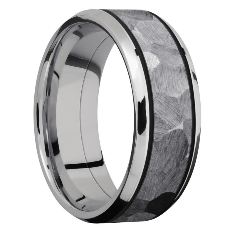 8 mm wide/Beveled/Cobalt Chrome band with one 5 mm Centered inlay of Tantalum.