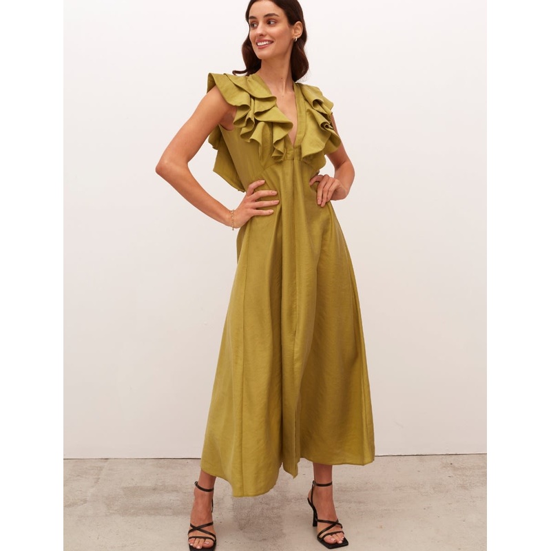 When it comes to dresses that know how to make a statement, this Coco midi is top of the list. Ruffles adorn the neckline to create a true head-turning look that works well for weddings and parties.