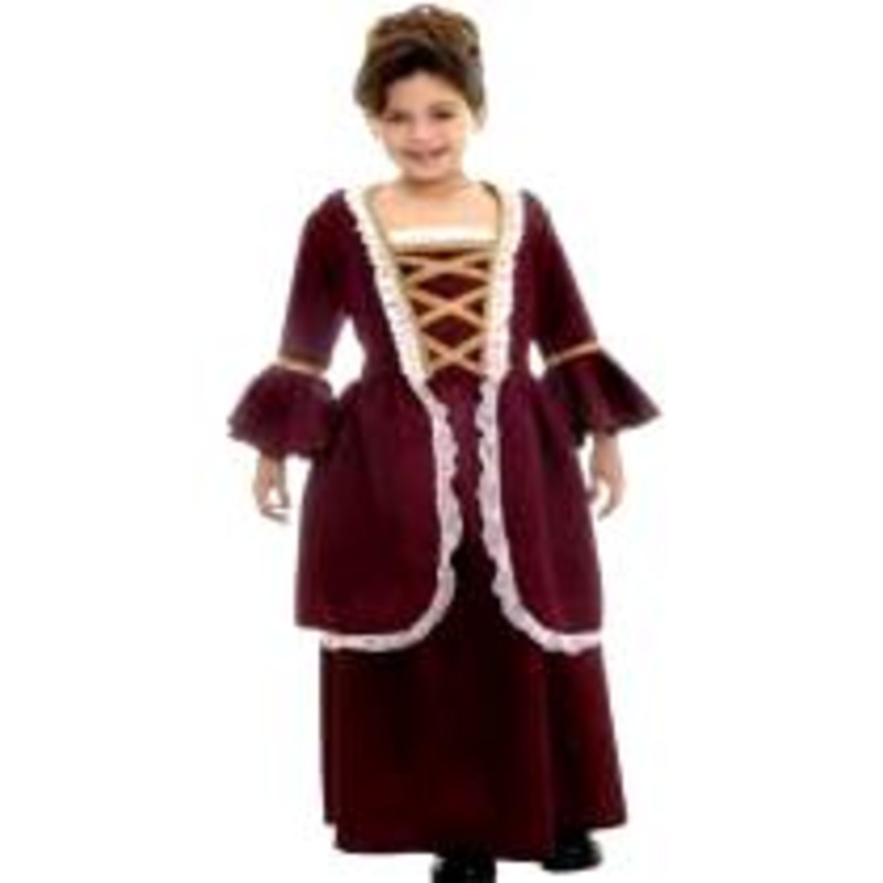 Includes: Burgundy dress with 3/4 length sleeves, accented with white laceand gold trim. Size Child: M (6-8)Colors: Burgundy