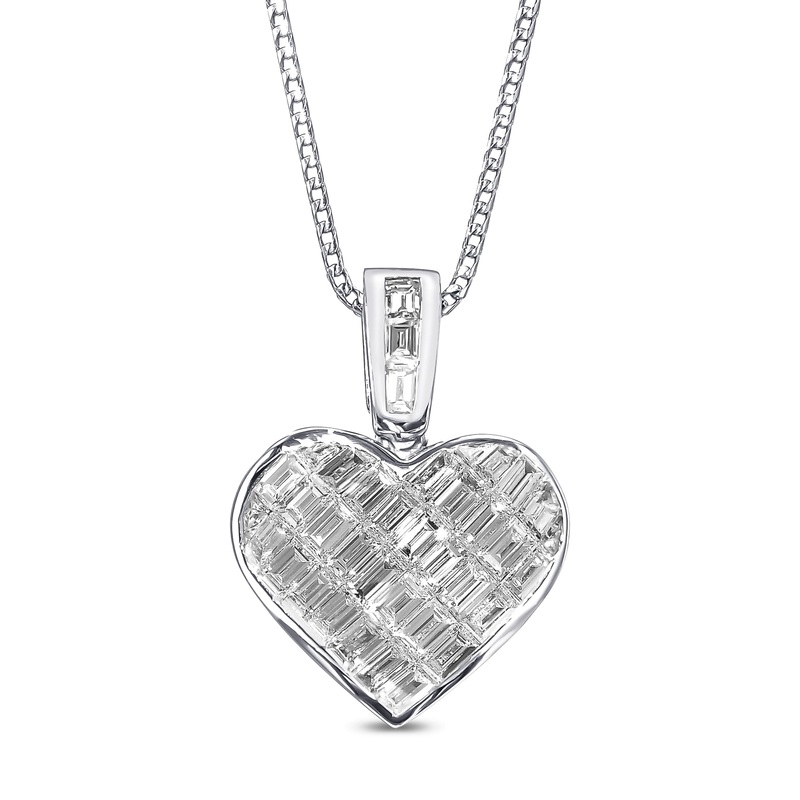 A stylish Collection color Heart shape diamond pendant, featuring 2.51cts baguettes, styled in a channel setting with a bezel edging. The bolt also features brilliants, adding to the charm of this pendant. Mounted in 18K white gold.