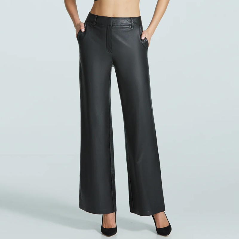 Commando Faux Leather Wide Leg in Black.Commando's Faux Leather Wide Leg Trouser Pants are made from our signature four-way stretch faux leather, a machine washable fabric that looks and feels just like the real thing. This chic style is constructed with a