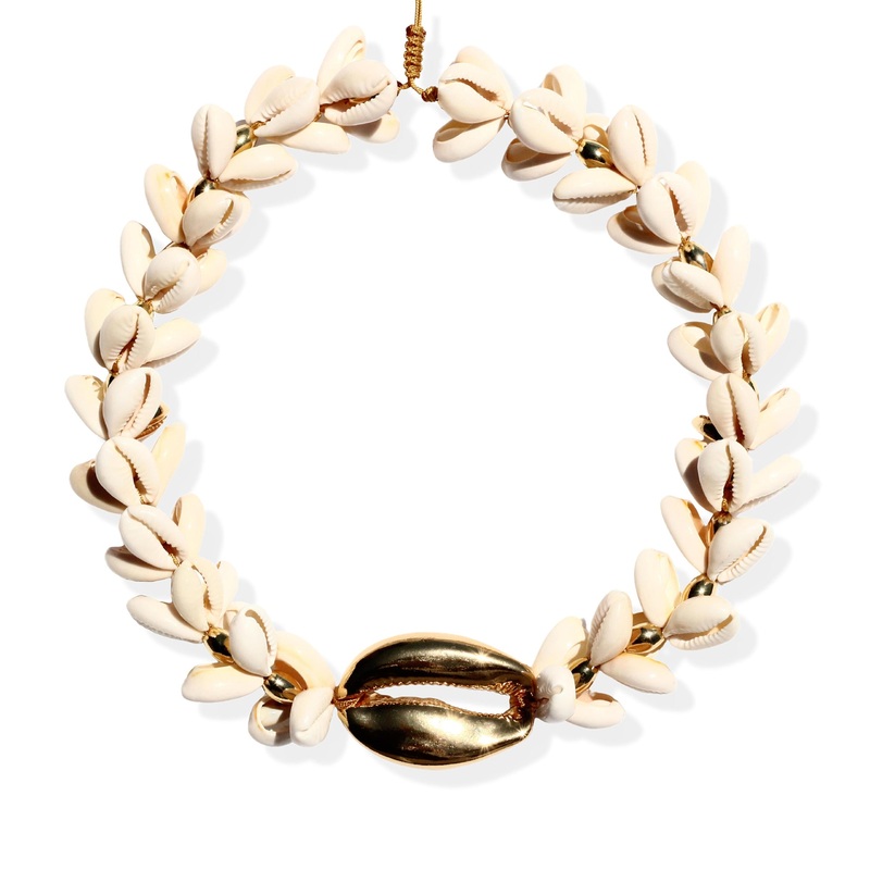 24ctgold plated brass mega puka necklace with natural cowrie shells and golden shells.