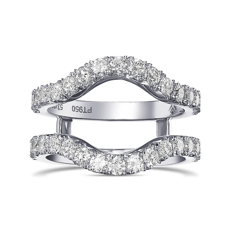 Contoured diamond wedding jacket ring, featuring colorless round brilliant diamonds. Mounted in 18K white gold.
