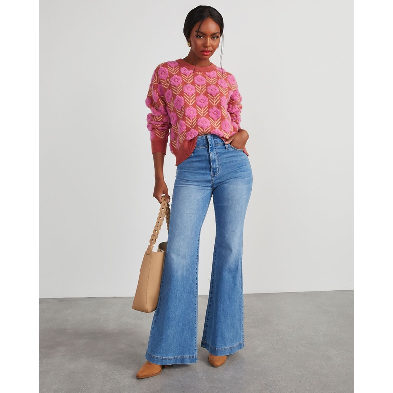 True to size Crew neckline Textured floral print Long sleeves Ribbed cuffs & hem Non-stretch, sweater knit fabric 42% Acrylic 30% Polyester 28% Nylon Hand Wash Cold, Line Dry