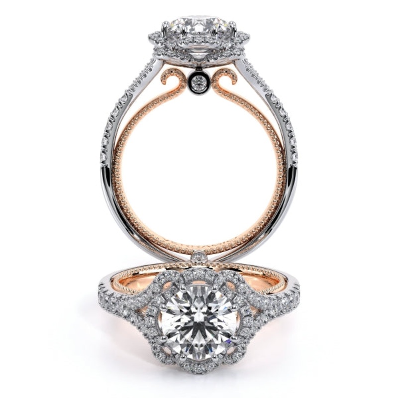 This Verragio Couture 18 karat white and rose gold double floret halo semi-mount engagement ring features a pave couture peekaboo pointed shank accented with round brilliant cut diamonds totaling 0.40 carats with quality characteristics of F/G color and VS
