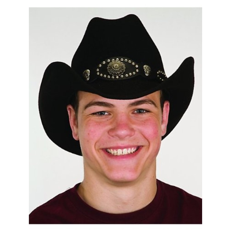 Look fancier than any rhinestone cowboy when you put on this Wool Felt Cowboy with Stud Band! Each black hat has a bent brim and black pleather belt full of brass studs. Great for your Western-themed outfit.