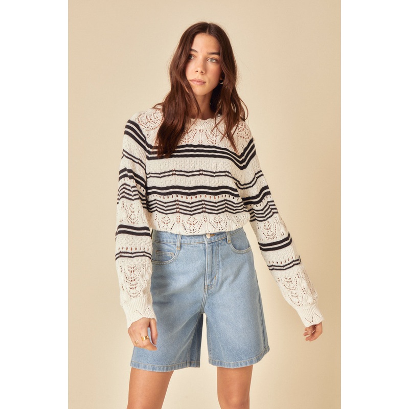 Delicate and detailed. Coming in cream with navy stripes, we love the intricate crochet detail on our jumper. Its complete with scallop detail at the neck and a deep ribbed hem. Were wearing ours with jeans.