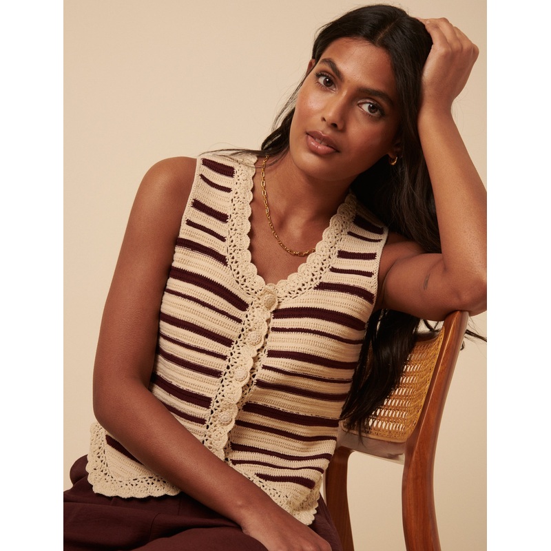 Crochet, all day. Coming in burgundy and cream stripes, our crochet waistcoat features scalloped edges and crochet covered buttons. Scoop neck Button front Designed to be fitted Size tip: we recommend your usual size