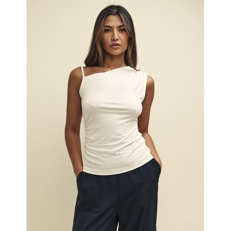 The one-shoulder look is back. Tapping into the asymmetric trend, this cream top includes statement ruching offset by a single strap. Style yours with your favourite denim. One-shoulder style Designed for a close cut