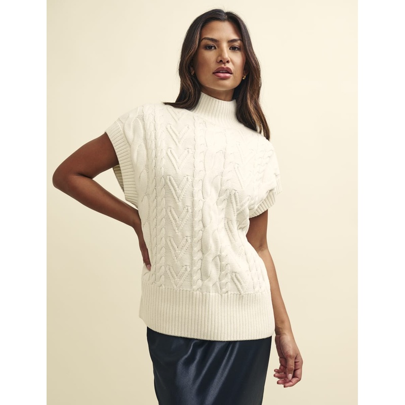 If youre looking for a cosy layer for the winter months, the search stops right here. This cream tabard features a cute heart-shaped cable knit design and short sleeves. Elevate yours with a satin skirt.Mock neckDropped shouldersRibbed hemDesigned for an o