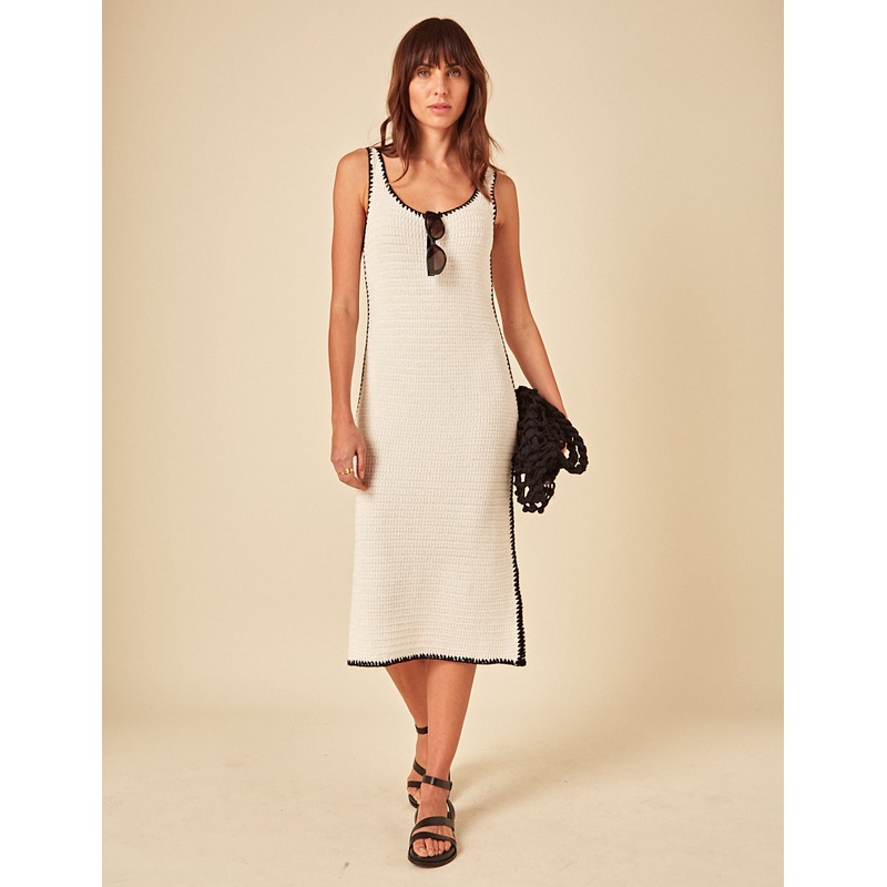 A little texture goes a long way. This cream dress features black contrast whipstitch edges and a relaxed crew neckline. Just add sunnies and sandals.Scoop neckSleevelessSize tip: we recommend your usual size