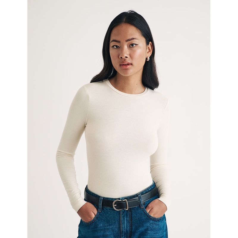 A true essential. With a round neckline and long sleeves, this soft cream top is the perfect layering piece. Style with your favourite jeans or layer under pinnies, waistcoats, dungarees and more. Round neck Long sleeves Soft stretch jersey fabric Designed