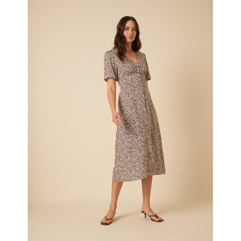 Meet your new favourite midi. Coming in a ditsy floral print, we love the V-neckline, button front detailing and centre slit. Were wearing ours with barely-there sandals. V-neck Short sleeves Button-front detail Concealed zip fastening Size tip: we recomme