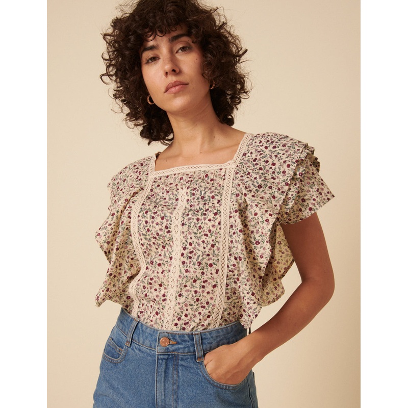 Our Nevada blouse is all about delicate charm. Coming in cream with a soft floral print, we love the feminine lace accents along the square neckline. Shes finished with frills at the short sleeves and buttons at the back. Style with shorts. Square neck Sho