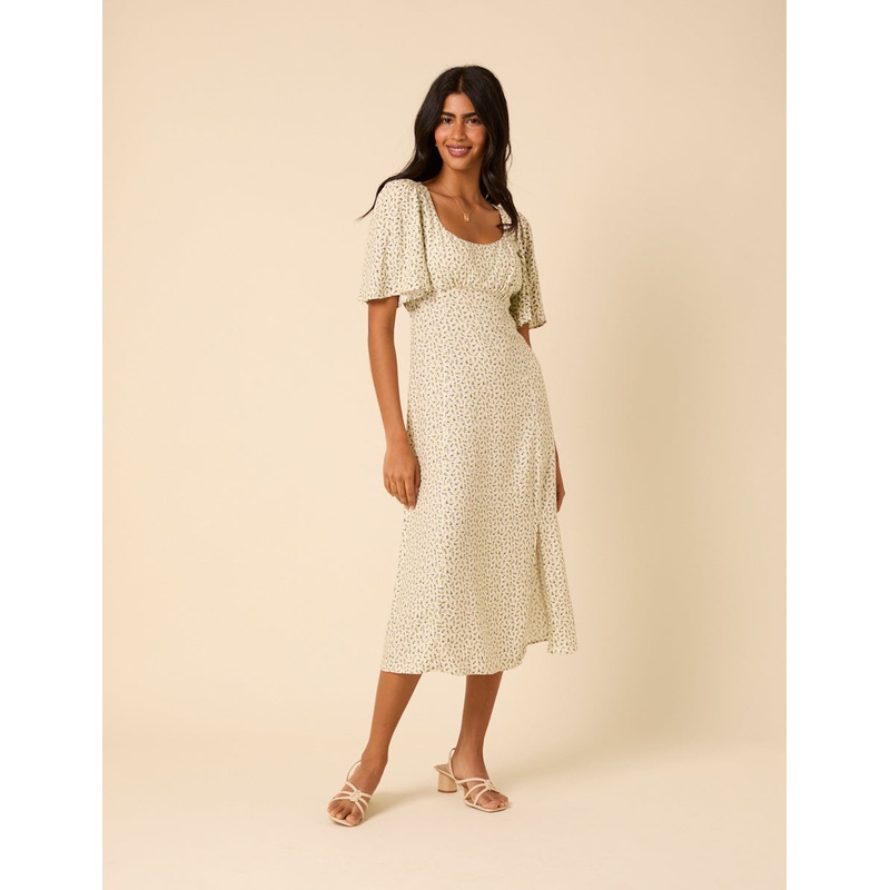 Square neck Empire waist Front slit Concealed zip fastening Size tip: we recommend your usual size