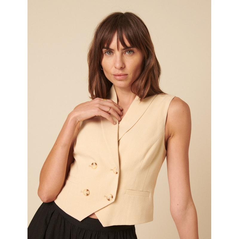 This cream waistcoat will become your new go-to. Its designed with modern tailored details like the welt pockets and adjustable strap at the back. Wear it as a two-piece with the matching tailored trousers. V-neck Welt pockets Double breasted buttons Adjus
