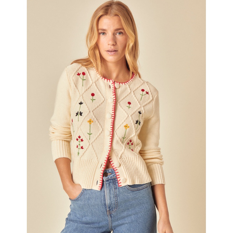 In full bloom. Planted with knitted florals, this cream cardigan has a folk-inspired feel. Cable detailing and a whipstitch trim add to the look.