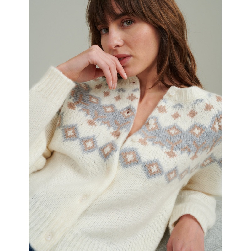Were fawning over Fair Isle. This cream cardigan is sure to keep you cosy. Dont miss the soft ribbed trims, classic crew neck and flattering button front. Wear with your favourite denim and finish with boots.