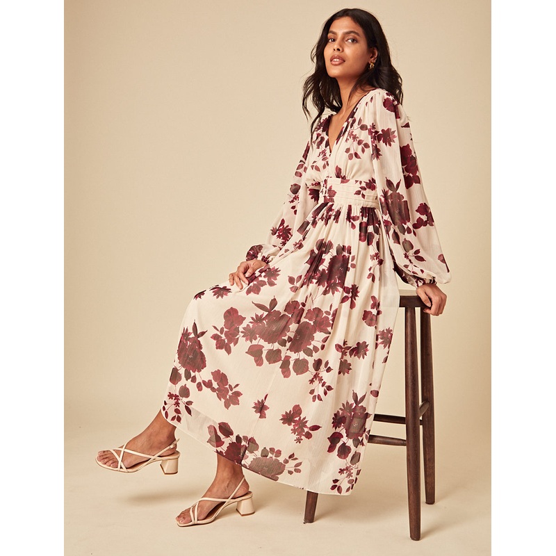 Get ready for an all-eyes-on-me moment in Anya. Shes an occasion dress to end all others. Drawing attention with her burgundy and white floral print and voluminous puff sleeves, this midaxi dress features a fitted waist and a pretty line of fabric covered buttons. Finish with your favourite jewellery.
