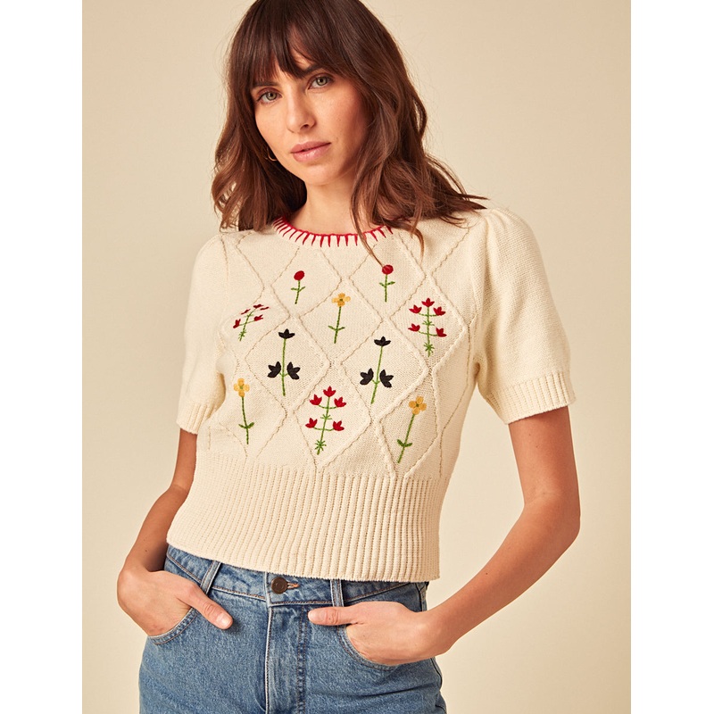 The easiest way to add texture to your outfit. This cream knit tee is embroidered with delicate florals and thick ribbed trims. Style with wide leg jeans and go. Crew neck Short sleeves Ribbed trims We recommend folding your knits to avoid any unwanted str