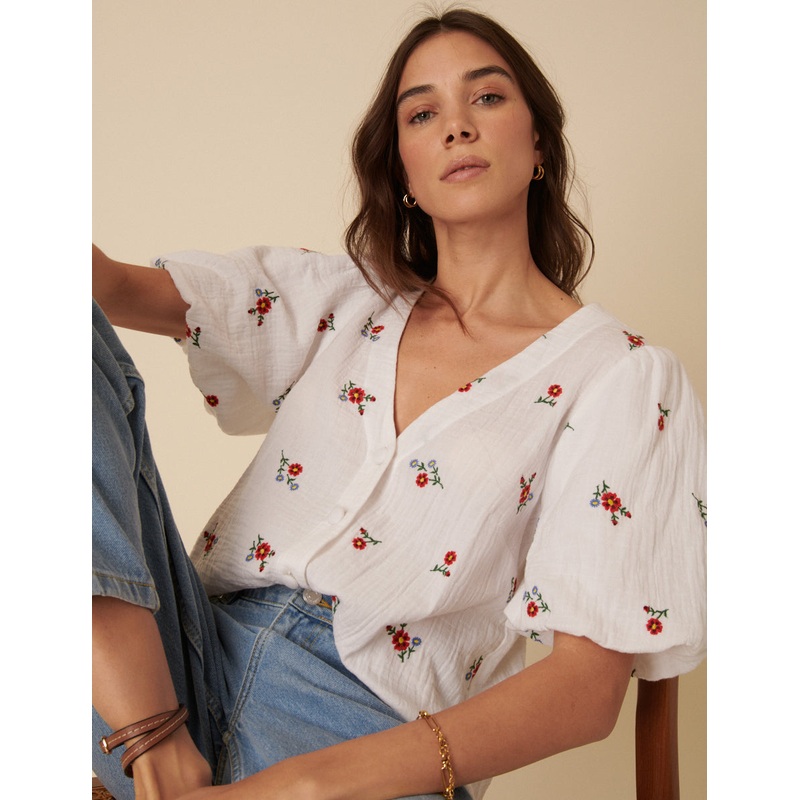 Ready for sunshine. With pretty embroidered flowers, this white top is designed for a super relaxed feel, its sure to take you through spring and well into summer. Style yours with denim. V-neck Short puff sleeves Button front New improved fit: we recommen