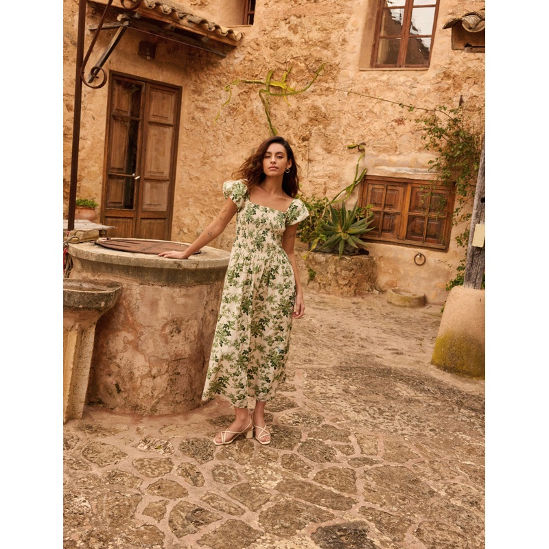 Coming in a green and cream floral print, we love the short fluttery sleeves and shirred bodice for shape. The square neck and drop waist give her a breezy, throw-on kind of feel.