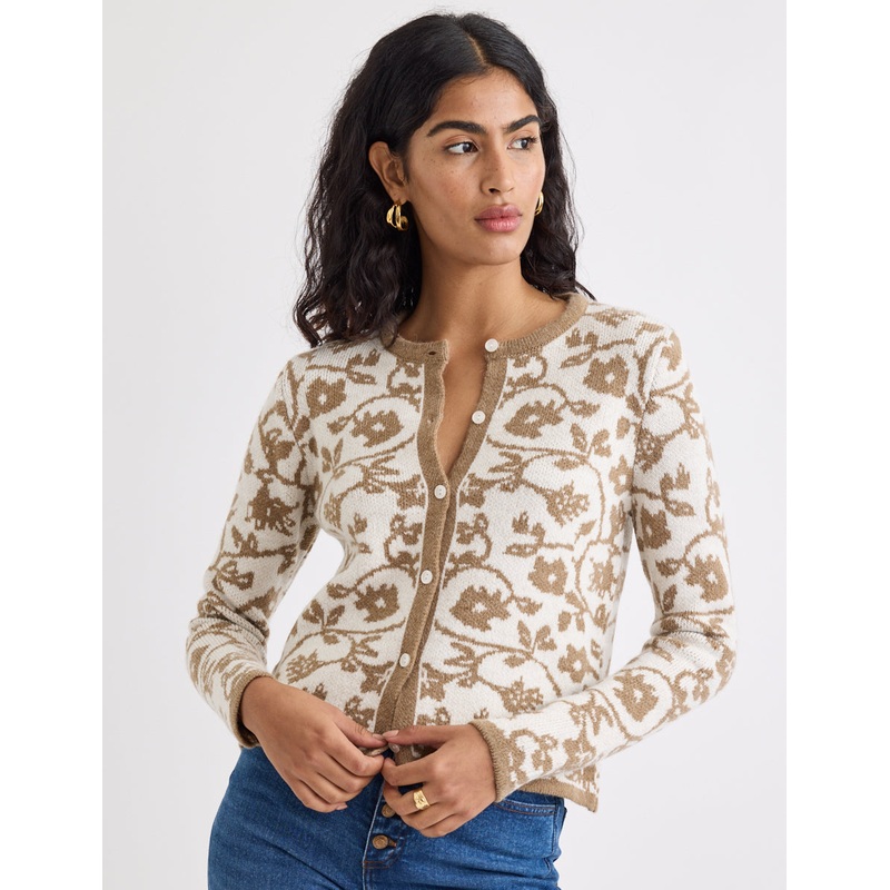 Flower power, but make it cosy. This floral cardigan is your new go-to layer. We love the crew neck, jacquard print and contrasting buttons. Wear yours with jeans and boots for an autumnal look.Crew neckButton frontLong sleevesWe recommend folding your kni
