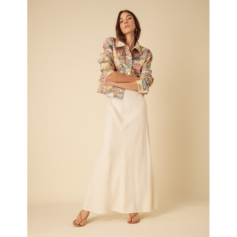 Our sell-out Mila skirt is back. Coming in cream, style yours with a top and barely-there heels for that thing youve got planned.