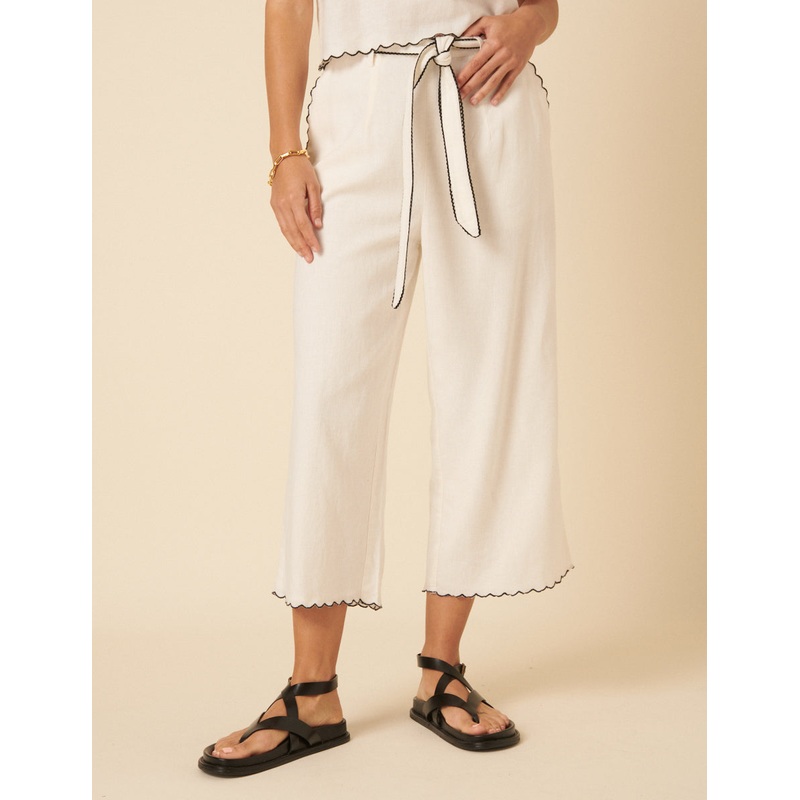 It's all in the details. These white trousers sit high on the waist and fall to a stylish wide leg. We love the contrast black stitching, pretty scalloped edges and belt that ties everything together. Wear with our matching top for a coordinated look. Belt