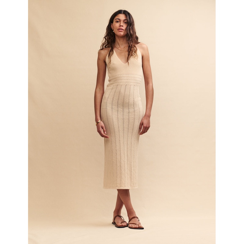 A moment for the detail on this midi dress. This cream tie-up style features a combination of different knitting techniques for a bohemian-inspired look. Its perfect for holiday with an open back that loops into a bow. Elevate yours with gold jewellery.