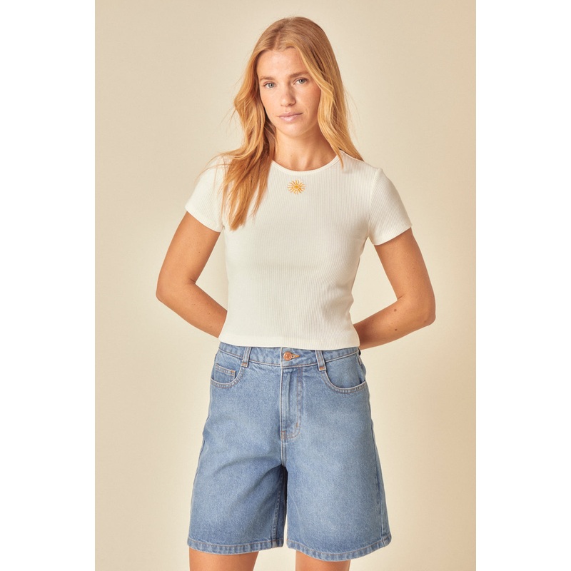 A little sunshine goes a long way. Coming in cream, our ribbed, fitted baby tee features golden sunshine embroidery at the neckline. Its perfect for everyday. Crew neck Short sleeves Designed to be fitted Size tip: we recommend your usual size