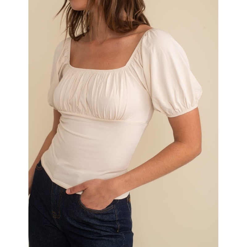 Oh this new number? This soft cream top is sure to elicit all the compliments. It comes with a square neckline, ruched bodice and puff sleeves. Add it to your wardrobe itll go with everything.Square neck Short puff sleevesSoft stretch jersey fabricDesigned