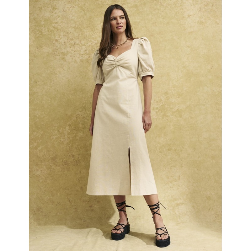 Our vintage-inspired Rosie dress takes style notes from the past to create something so-now. We love her sweetheart neckline detailed with ruching, lightly puffed sleeves and a subtle slit. Style yours with chunky slides.Sweetheart neckMid-length sleevesCo