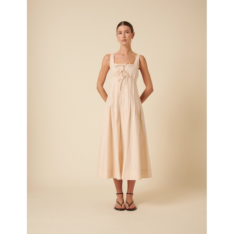 Perfect in Penelope. Coming in the cream, our midi dress is designed with a pleated bodice with bow detailing and thick straps. Its flowy A-line skirt is perfect for twirling through your day, whatever it has in store. Weve styled ours with barely-there heels.