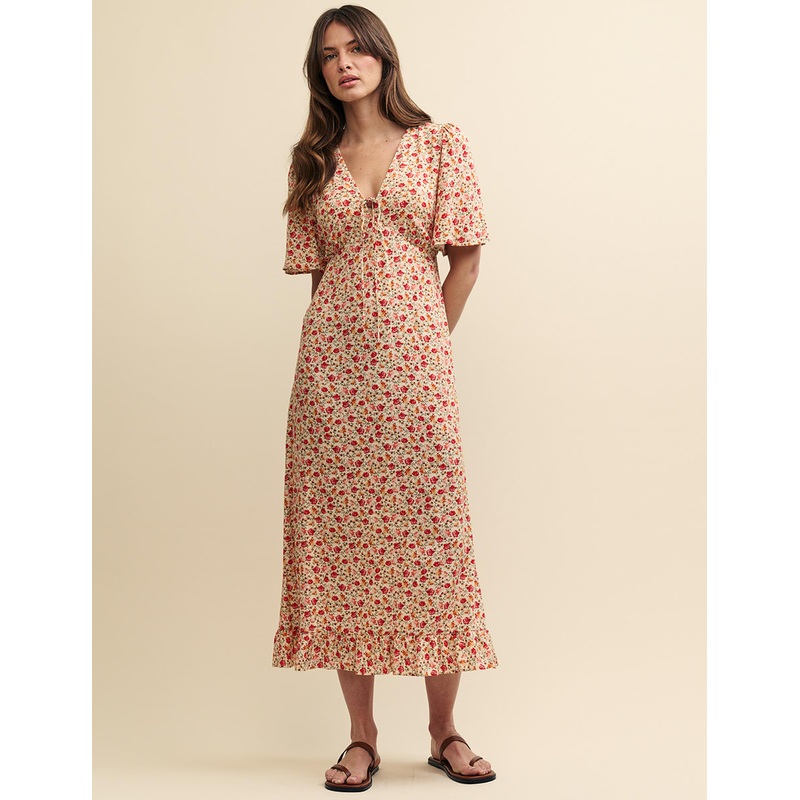 Dalia is a wildflower printed dress with flowing angel sleeves and a ruffled hem. Floaty by nature, this midi pulls you in the waist before falling into a loose skirt. She drapes like a dream, accent yours with gold jewellery.V-neckFluted sleevesString tie