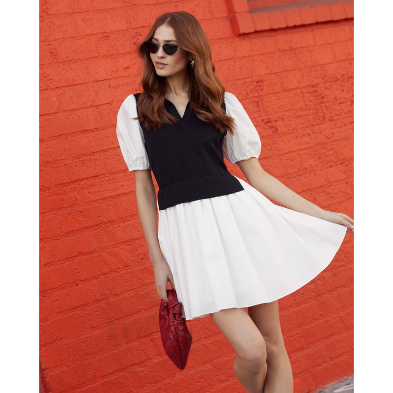 Mixing two staples into one unforgettable silhouette, the Crista Colorblock Puff Sleeve Mini Dress features a flowy cotton mini dress with a contrast, collared sweater. Accentuated by feminine puff sleeves, this mini dress is perfect for work and play.