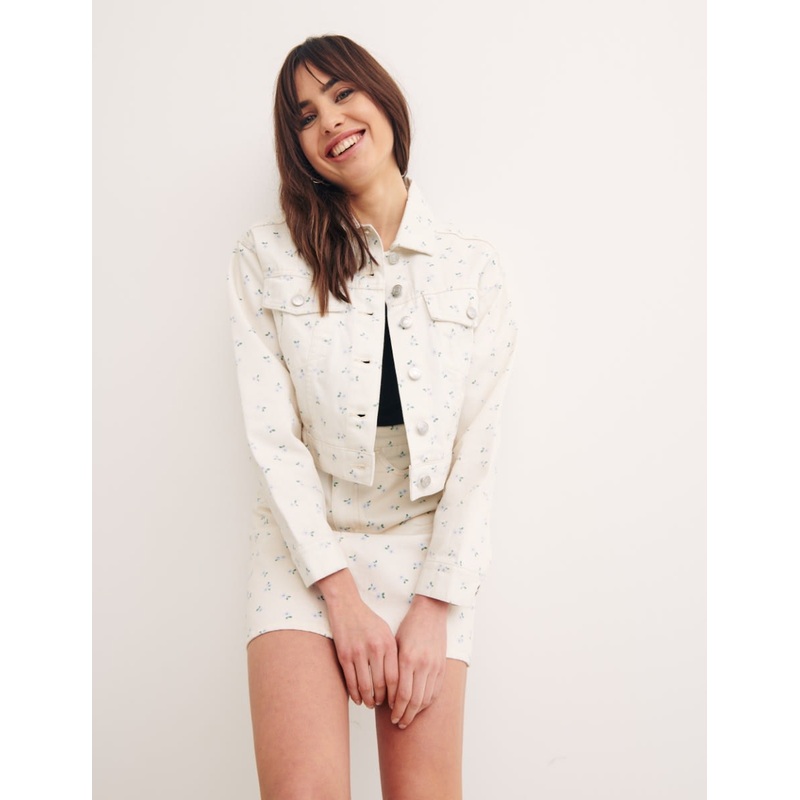 Part of a cute co-ord set, this printed denim jacket is set to be your new go-to. It's patterned with sweet floral embroidery. A classic silhouette updated by an ecru background gives it an ultra summery feel. Team with the matching skirt or wear with your