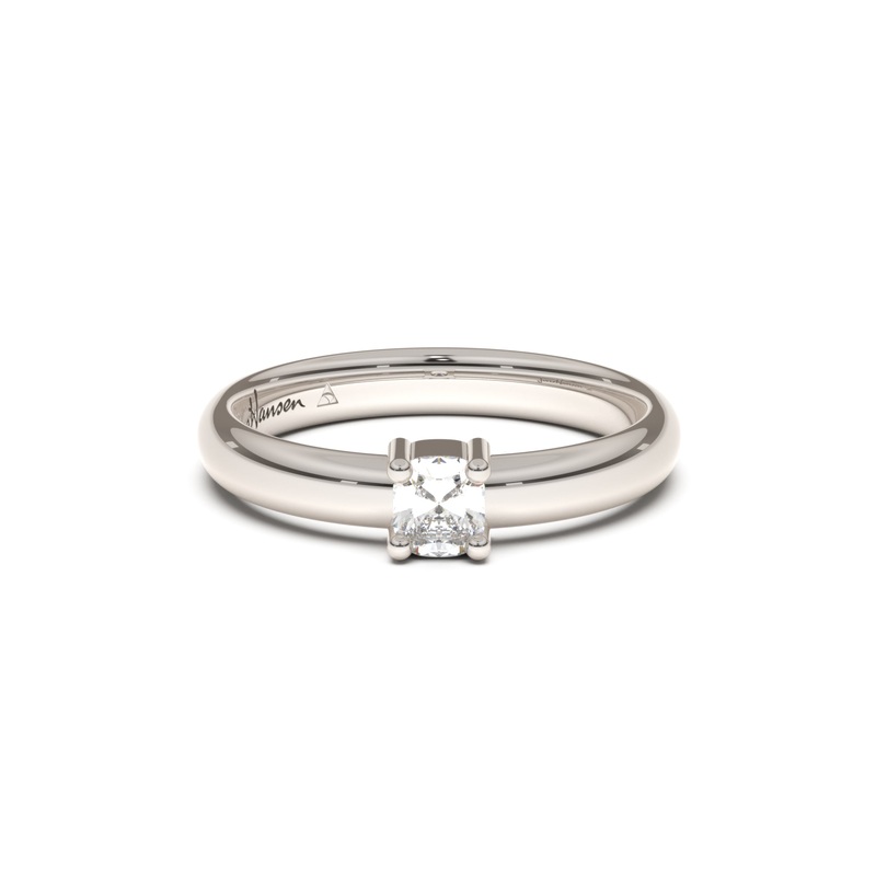 Elegant traditional styling, fashioned in white gold or platinum, this ring features a four prong setting that showcases the brilliance of the cushion cut diamond.The band has the same unique shape as our famous replica ring and is engravable putting this