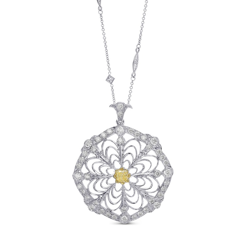 A fabulous fancy intense yellow and F color diamond pendant, with a center fancy intense yellow cushion diamond weighing 0.53cts. The pendant has a distinctive floral halo style embellished with bezel set collection color brilliants, and mounted in 18K white and yellow gold.