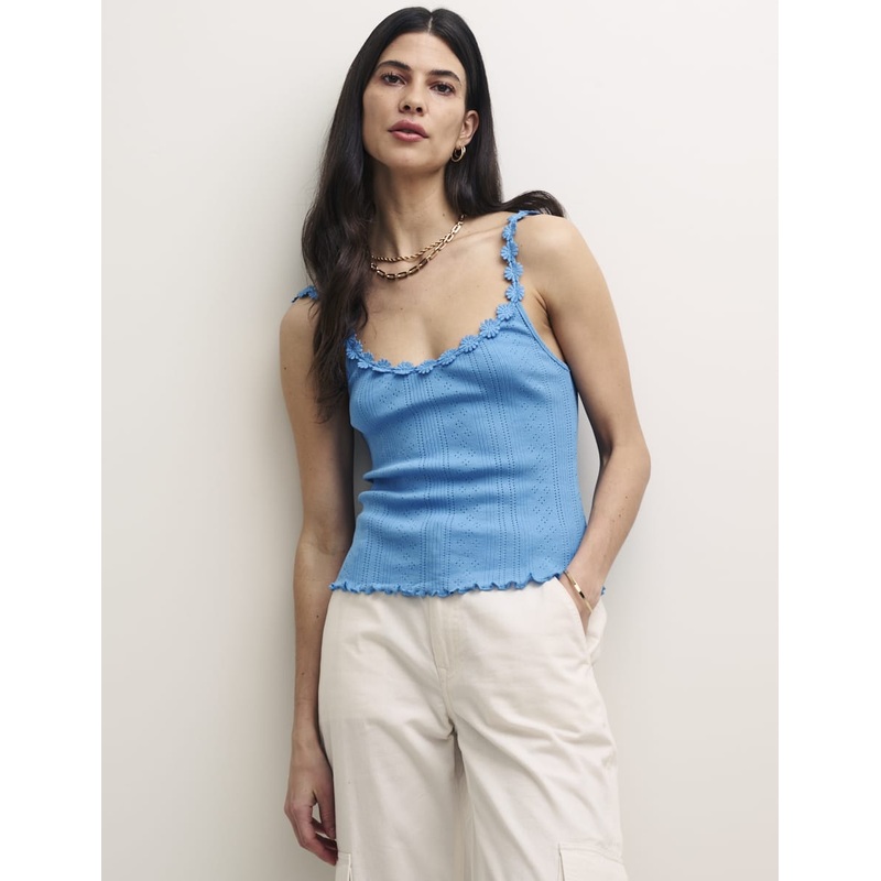 Trimmed with daisy chain straps, this bright blue cami is perfect for sun-drenched days. Its detailed with pointelle and a frilled lettuce hem. When the summer breeze comes in, wear it as a two-piece with the matching cardigan.