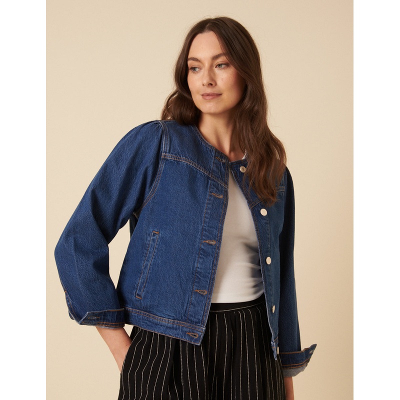 A new denim jacket to add to your rotation. Coming in a classic dark wash, we love the round neck, seam details and button front. Wear yours with everything you already own.