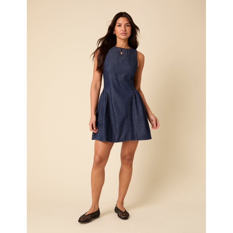 The denim mini must-have. With a crew neck, fitted seams and a pleated drop waist, this one's ready for all your sunny plans. Crew neck Concealed zip fastening Designed to be semi-fitted Size tip: we recommend your usual size